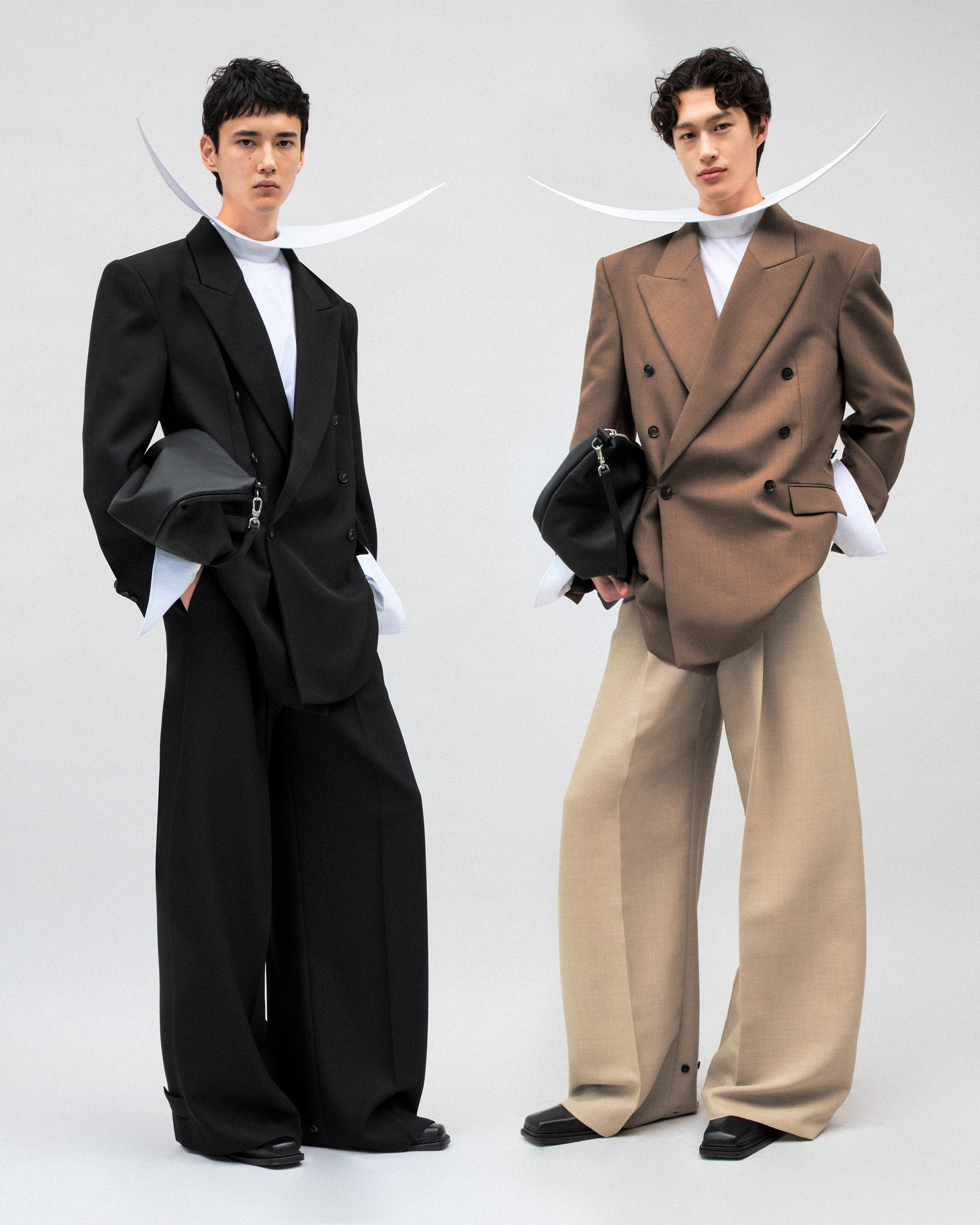 As always, it’s about silhouette; EGONLAB amplifies the volume and exaggerates the shoulders and proportions of tailoring. Sometimes, the brand even sees double by doubling skirts and jackets.